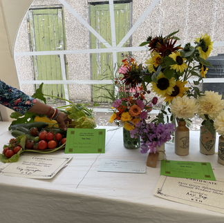 Sadly for the judges there were only 2 cakes for us to taste. Both were delicious and received their due honours. Both the fantasy animals, part of multi age family displays, received awards. Those who went round the displays in the afternoon, will have noticed that alongside assessing whole displays, the judges picked out items within a display for special notice. As an example a vase of Sweet-Peas in a mixed group of flowers. More of this next year please - make the judges job harder!